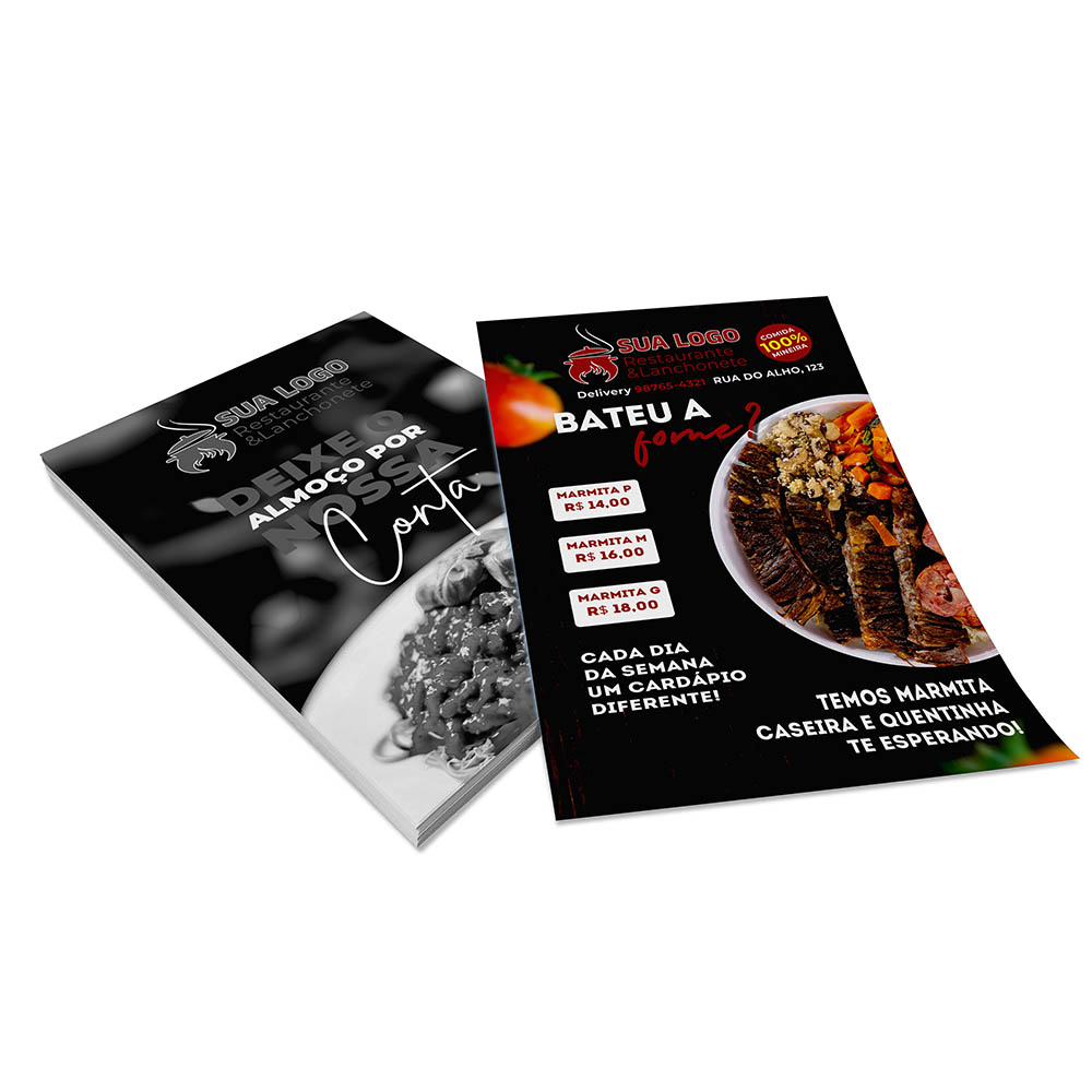 Frente colorida em CMYK e verso impresso só em preto (tons de cinza).