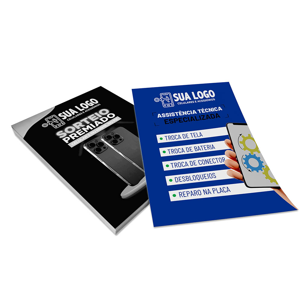 Frente colorida em CMYK e verso impresso só em preto (tons de cinza).