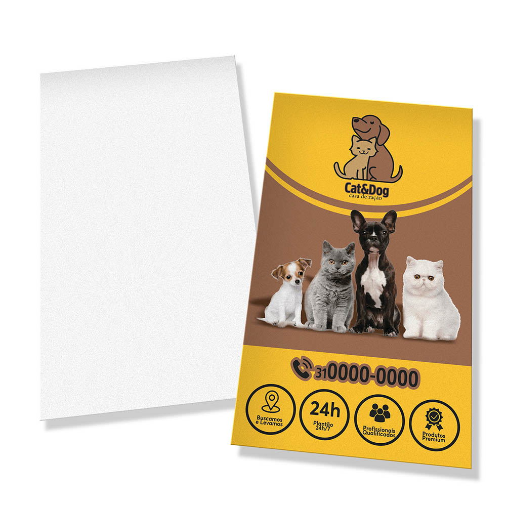 Impressão colorida em CMYK apenas na frente; o verso fica em branco.