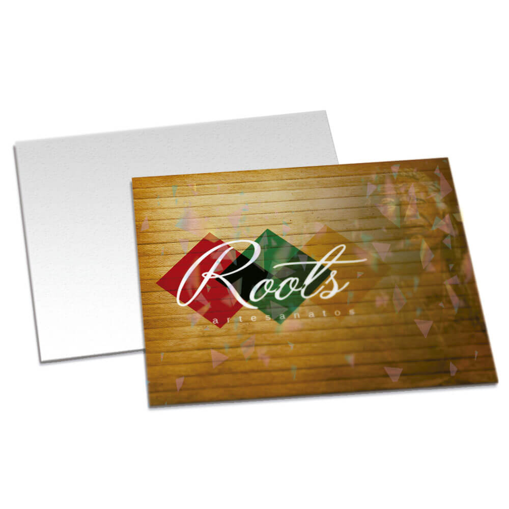 Impressão colorida em CMYK apenas na frente; o verso fica em branco.