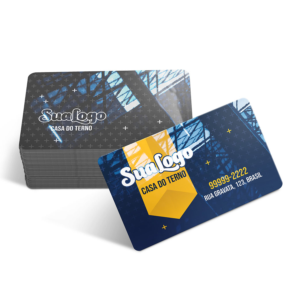 Frente colorida em CMYK e verso impresso só em preto (tons de cinza).